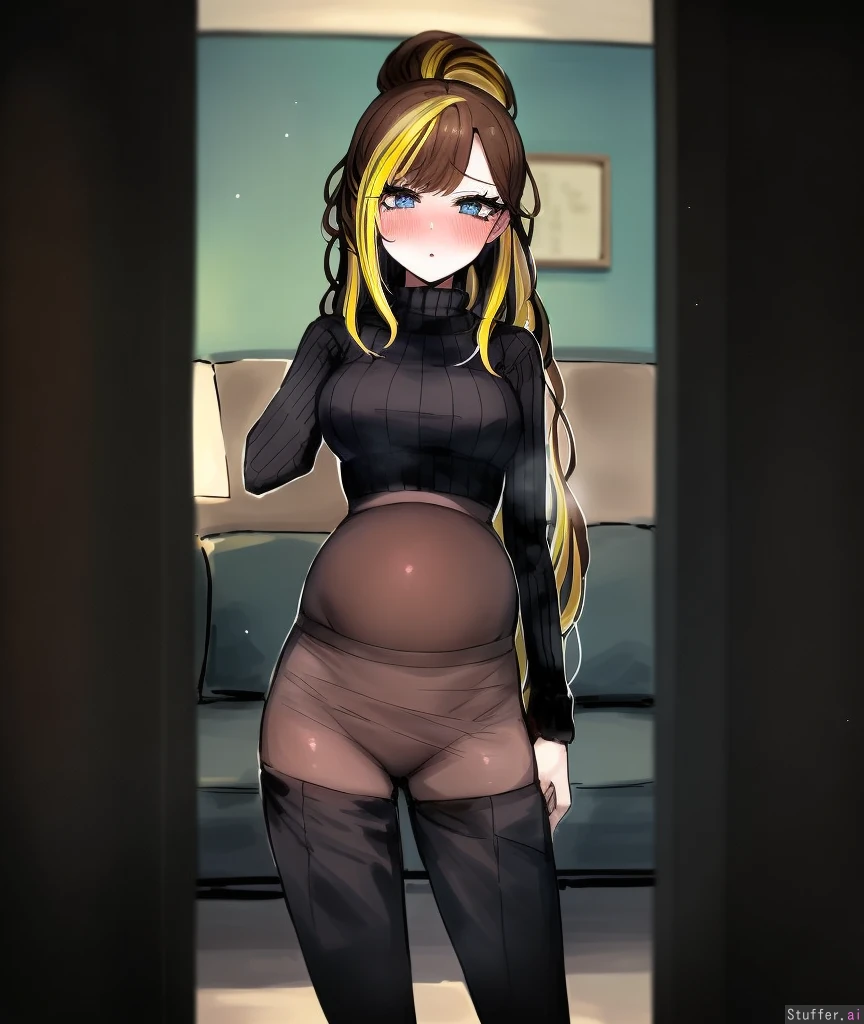 best quality, high rating, best quality, high rating, best quality, high rating , c.cu(artist), stunning beauty, gorgeous, flawless, absurdres, perfect image, perfect human anatomy, highly detailed skin texture, intricate detail, delicate details, sophisticated detail, ultra high quality, masterpiece, 8k , ultra high resolution, absurd resolution, (perfect body, perfect skin, perfect hair, perfect eyes, perfect face, perfect hands, perfect clothes), (beautiful body, beautiful skin, beautiful hair, beautiful eyes, beautiful face, beautiful hands, beautiful clothes), (1girl, anime art style:1.5) ((Adult:1.6)), (model, fitness, athletic), ((Very Cute)) (very cute, young, beautiful, attractive) ((Warm Personality)) ((Lovely)) , (tall, Slim, Skinny Body, Skinny Legs, Slender arms, Lean body) , (black mascara, black eyeliner, black eye shadow, long eyelashes wide eyes, Ice blue Eyes, Intricate body) , (Brunette with Blonde streaks:1.9) ((Brown hair with blonde streaks:1.9)), (Very long hair), ((Turtleneck Black Sweater)) ((Loose Black Full Sweatpants)) ((Apartment:1.7)) ((Messy Ponytail)) ((Middle Part)) ((Hair strands Slightly covering her eyes)) ,((Thin face)) (((Blushing:1.9))) ,((Bright)) ((Living room:1.5)), ((Living Room Background:1.4)) ((Standing In Doorway)) ((Small Pot Belly:1.5)) ((Stuffed Belly)) ((Surprised)) ((Covered Belly)) ((angry)) ((Shocked eyes)) ((Looking at Viewer)) ((Hands Folded))