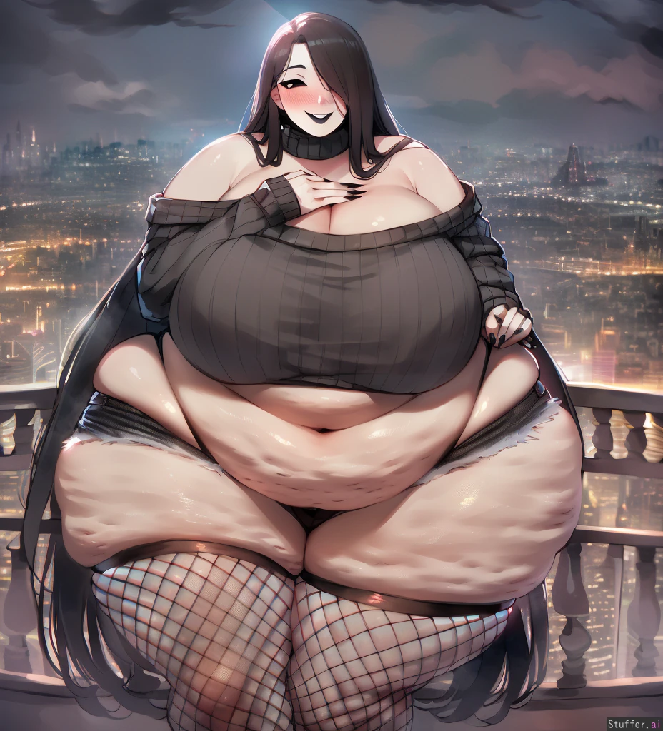 ((best quality)), high rating, (best quality), (high rating), best quality, high rating, best quality, high rating, absurd res, high res, detailed, ultra quality, ((high quality)), masterpiece, (ultra high resolution), photorealistic, detailed face, intricate detail, sophisticated detail, exquisite detail, absurd resolution, correct anatomy, 8k, (highly detailed face), (highly detailed skin texture, gorgeous, beautiful face, stunning beauty), ((masterpiece)), ((Slim face:1.9)) c.cu(artist), ((Tall:1.5)) Betterwithsalt(artist), spellsx(artist), dynamic lighting, shading, detailed face, perfect face, perfect eyes, beautiful face, beautiful eyes, Beautiful shadows, High image quality, Extremely realistic shading, beautiful face, best quality, masterpiece, perfect face, 1girl, Best quality, high rating, masterpiece, correct anatomy, sharp focus, uhd, beautiful, detailed face, definition lines, high quality, crisp and clean linework, flawless , goth , goth girl, ((very long hair)), black lipstick, Long eyelashes, big eyes, wide eyes, Black eyeliner, Black eyes, (Black fingernails) , Black nail polish, (Long fingernails) , (anime), 1 girl, masterpiece, definition lines, high quality, absurdres dynamic lighting, ((high rating)), detailed face, (adult), ((Balcony:1.6)), ((City_Background:1.6)), thick, chubby, ((Large Bulging belly)) , (((Hyper boobs:1.8))), wide hips, huge ass, bbw, (hyper thighs), cleavage, USSBBW, ((Deep Navel)) , expanding, lines, (fishnet stockings:1.6), ((Smiling:1.8)), ((Fishnet Leggings)), (((Skin_Dentation:1.8))), (((Black off shoulder sweater:1.7))) ,((black denim shorts)), (Black_thong) , (whale tail) , ((Large Belly Overflowing Shorts)), ((Belly Overhang:1.7)) , full body shot, laying on bed, (((fat, obese))), saddlebag hips, (wide hips:2.3), (((huge ass:1.8))), ((bubble butt)), (thick thighs:1.8), (((Blushing:1.8))), (((cellulite))), (hair_over_one_eye:1.7), ((Hands on Own Chest))