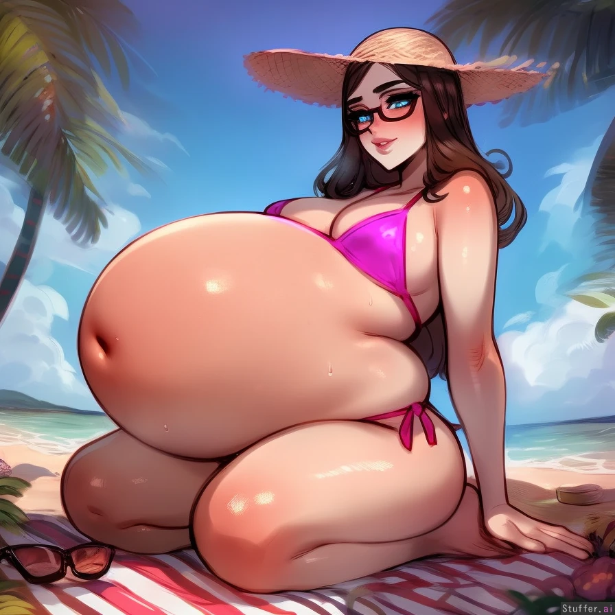 best quality, high rating, (best quality), (high rating), best quality, high rating, best quality, high rating, absurd res, high res, detailed, ultra quality, ((high quality)), masterpiece, (ultra high resolution), photorealistic, detailed face, intricate detail, sophisticated detail, exquisite detail, absurd resolution, correct anatomy, 8k, beach setting, at the beach, sunny, bright, (highly detailed face), thin glasses, beautiful flawless skin, beautiful face, stunning beauty, slim face, blushyspicy(artist), c.cu(artist), long brown hair, beautiful hair, perfect blue eyes, full lips, succulent lips, soft smile, horny, turned on, heart effects, on knees, full body, young woman, 1woman, slim figure, small pink bikini top, small pink bikini bottoms, medium breasts, big plump breasts, ((breasts:1.8)), ((large stuffed belly:1.6)), tight swollen belly, distended heavy belly, ((stuffed full:1.6)), ((swollen belly:1.6)), globular round belly,((torpedo belly:1.4)), innie navel, large rotund belly, full belly, belly about to burst, weight gain, stuffed, ((chubby waist:1.4)) soft waist, curvy waist, soft hips, slim hips, curvy hips, long sexy legs, thick thighs, ((thick sexy thighs:1.4)), thick curvy butt, chubby butt, sun hat, straw sun hat, pink bow, holding belly, ((side angle:1.2))