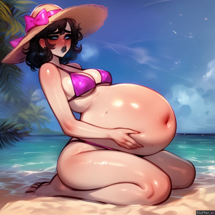 best quality, high rating, (best quality), (high rating), best quality, high rating, best quality, high rating, absurd res, high res, detailed, ultra quality, ((high quality)), masterpiece, (ultra high resolution), photorealistic, detailed face, intricate detail, sophisticated detail, exquisite detail, absurd resolution, correct anatomy, 8k, beach setting, at the beach, sunny, bright, (highly detailed face), beautiful flawless skin, pale skin, beautiful face, stunning beauty, slim face, blushyspicy(artist), c.cu(artist), short black hair, messy hair, detailed blue eyes, full lips, succulent lips, :<, embarrassed, horny, turned on, heart effects, on knees, full body, goth girl, tired eyes, 1woman, slim thick figure, small pink bikini top, small black bikini bottoms, medium breasts, big plump breasts, ((breasts:1.8)), ((large stuffed belly:1.6)), tight swollen belly, distended heavy belly, ((stuffed full:1.6)), ((swollen belly:1.6)), globular round belly,((torpedo belly:1.4)), innie navel, large rotund belly, full belly, belly about to burst, weight gain, stuffed, ((chubby waist:1.4)) soft waist, curvy waist, soft hips, slim hips, curvy hips, long sexy legs, thick thighs, ((thick sexy thighs:1.4)), thick curvy butt, chubby butt, sun hat, straw sun hat, pink bow, holding belly, ((side angle:1.2))