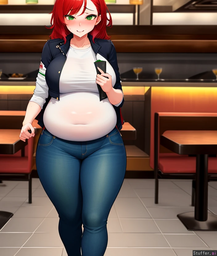 1girl,chubby,perspective, Red hair, green eyes, in a restaurant,tight clothes, jacket, jeans,bloated, nervous,sexy,shy, torn_clothes