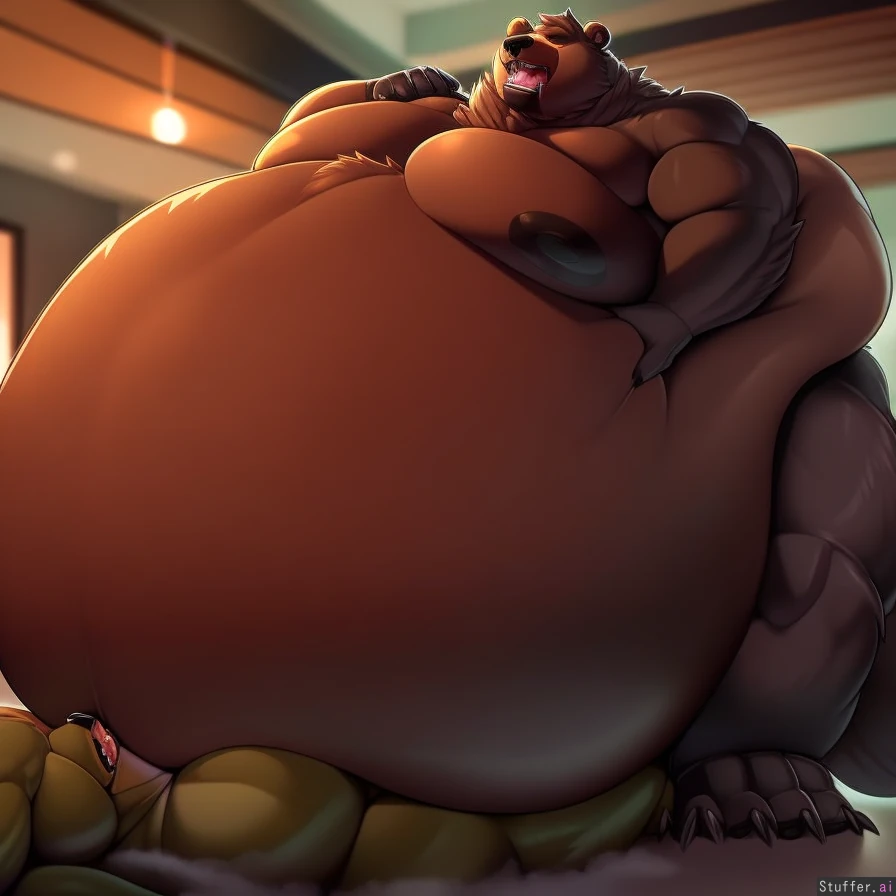 best quality, high rating, smooth skin, fat rolls, inflated, gigantic belly, inflated belly, belly bigger than whole body, male, furry, anthro, bear, pleasure, in natural habitat, male, stuffed, moobs, ssbhm, ssbbm