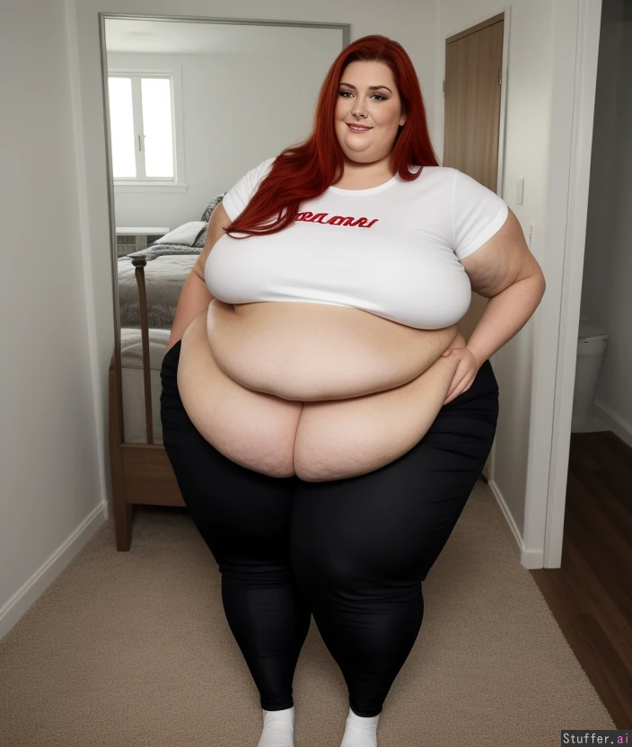 masterpiece, detailed background, detailed face, (beatiful face), fat face, high quality, ultra quality, smooth skin, smiling, long red hair, (white t-shirt), (black jeans), white socks, ussbbw, blob, (woman weighs 700lbs), (round belly:1.5), (large belly:1.5), (extremely wide hips:1.8), (fat breasts:1.3), double chin, fat feet, fat thighs, apartment, grey wooden floor, square carpet, standing up,