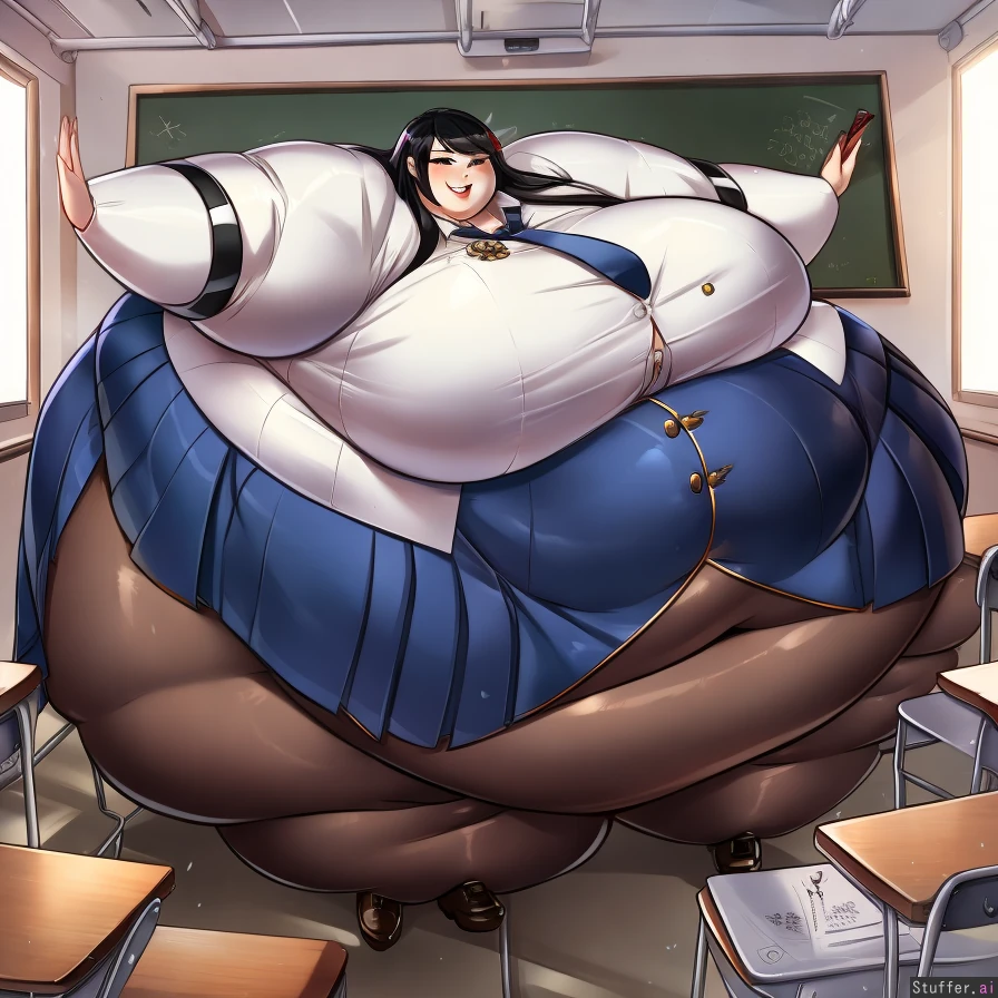 best quality, high rating, high quality, masterpiece, full body view, ((high resolution)), (intricate details), (((sophisticated detail))), 16k HD, UHD, HDR, (anime-styled), (manga-styled), RounderSofter(artist), betterwithsalt(artist), pixiveo(artist), ourobot(artist), full body view, dynamic lighting, (Detailed background), (Correct anatomy), (Detailed face), 1woman, ((beautiful face)), (perfect anatomy), massive tall body, long black hair, happy, ussbbw, (hyper morbidly obese), (colossal_belly), deep navel, (massive fat thighs), ((gigantic_wide_hips)), (huge_giant_ass), (massive fat arms), belly touches the ground, standing up straight, academy uniform, blue skirt, white blouse, black blazer, classroom,