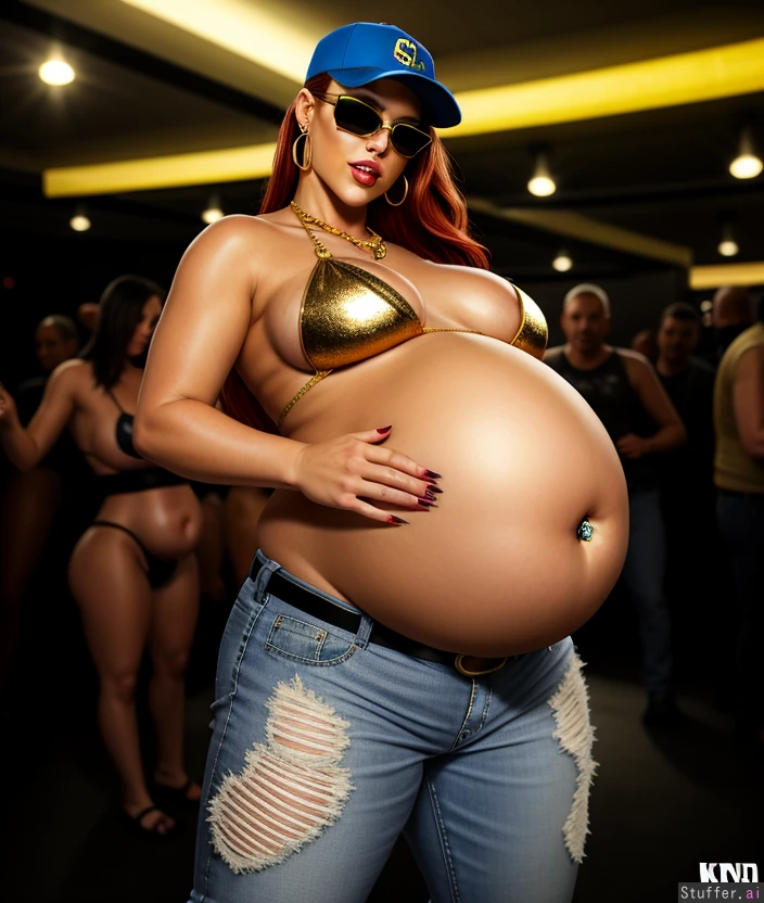 (((kendra lee ryan)))(pornstar)(stripper), provocative look, proud of being fat, playful, she enjoys showing her big belly, street dance, she wears many jewels, belly tattoo, fat girl, gold bikini top, (((sunglasses))), stylish, gold loop earrings, smiling, bbw stripper, dancer, long hair, round face, nice face, nightclub, dance floor, (alone), hip hop style, tiny thongs, very low rise cargo pants, torn pants, extrmely low pants, tight belt, massive belt buckle, round belly, big belly, inflated belly, bloated belly, beer belly, gold belly button piercing, diamond belly button piercing, (((belly button jewel))), big boobs, pregnant belly, realistic, ultra realistic, realistic face, realistic eyes, realistic hands, five realistic fingers, long nails, baseball cap, ponytail, red hair