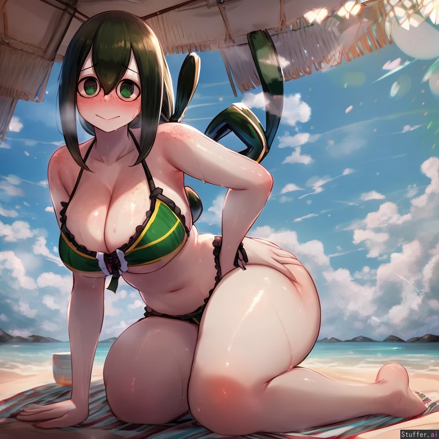 best quality, high rating, best_quality, high_rating, highres, absurdres, Better_w_salt\(artist\), c.cu\(artist\), spells_x\(artist\), icecake\(artist\), alicegromovaff\(artist\), PreSiArt\(artist\), rin_noheki\(artist\), miramiraclerun\(artist\), summer, day, hot, light, shaded, looking_at_viewer, on_knees, kneeling, sweating, frilled_bikini, 1girl, solo, beautiful, sexy, freckles, (sexy_pose), arms_at_sides, full_body, hands_on_thighs, wide_shot, (tsuyu_asui:1.35), short, (obese:0.5), small_breasts, (long_breasts:0.5) (flat_belly:1.0), (soft_belly:0.5), wide_hips, wide_ass, dumptruck_ass, fatass, wide_thighs, barefoot,