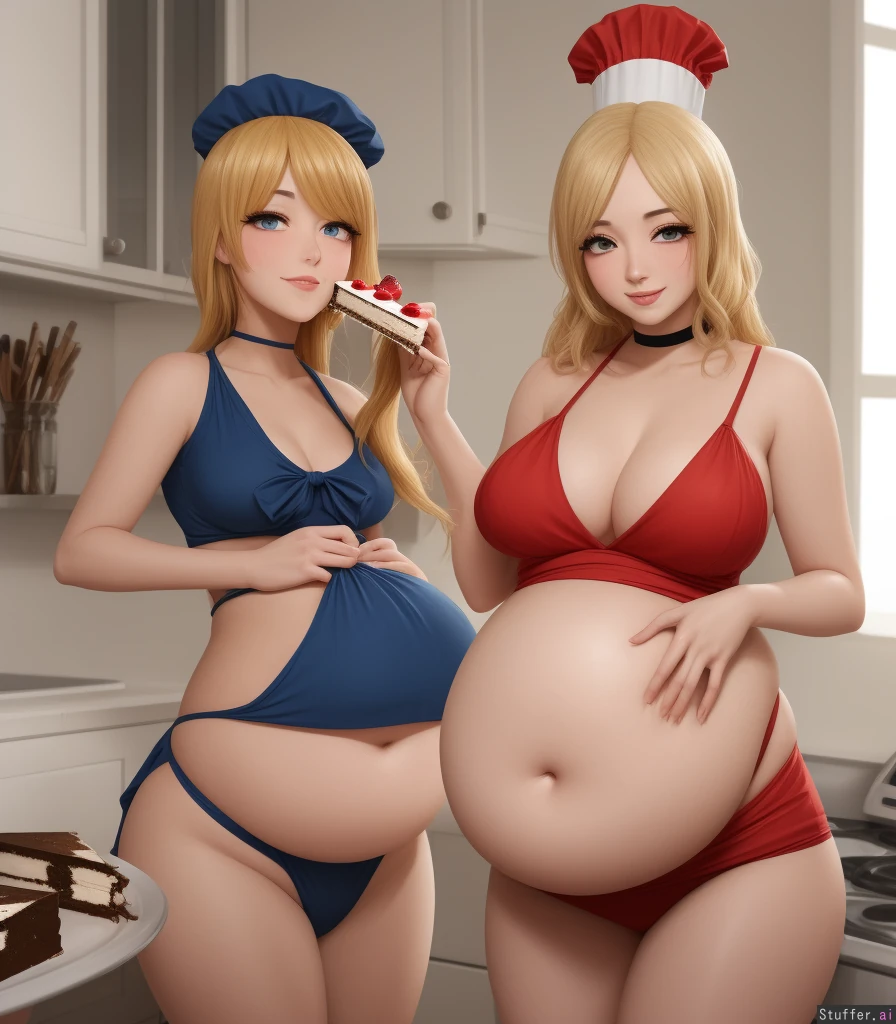 best quality, high rating, absurdres, hyper detail, highly detailed face, anime, anime coloring, expressive, detailed background, c.cu(artist), wamudraws(artist), oofrowdy(artist), mdf_an(artist), yuta_agc(artist), inushima(artist), coffeeslice(artist), one female, bright colors, full color, soft colors, vivid, effect lines, effects, Detailed Hair, Detailed face, (((Detailed Eyes))), Detailed Skin, 1woman, long blond hair, lidded eyes, smile, sexy, deep navel, soft belly, love handles, big thighs, wide hips, large butt, medium boobs, cozy home, kitchen, doughty belly, chef hat, pan, fridge, stove, greenery, blue bikini, long blue pencil skirt, ((protruding belly, sloshing belly)), ((1 hand palm on belly side)), white choker, ((eating piece of cake, face)), standing, blue eyes, 3/4 view, motion lines, ((slimthick)), (chubby arms), hanging belly