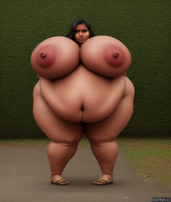 photorealistic young indian, Flabby hanging gut, facing forward standing up, out of breath, very red, ((huge hard nipples on enormous oversized breasts, bigger than her torso, nipples reach down to knees))