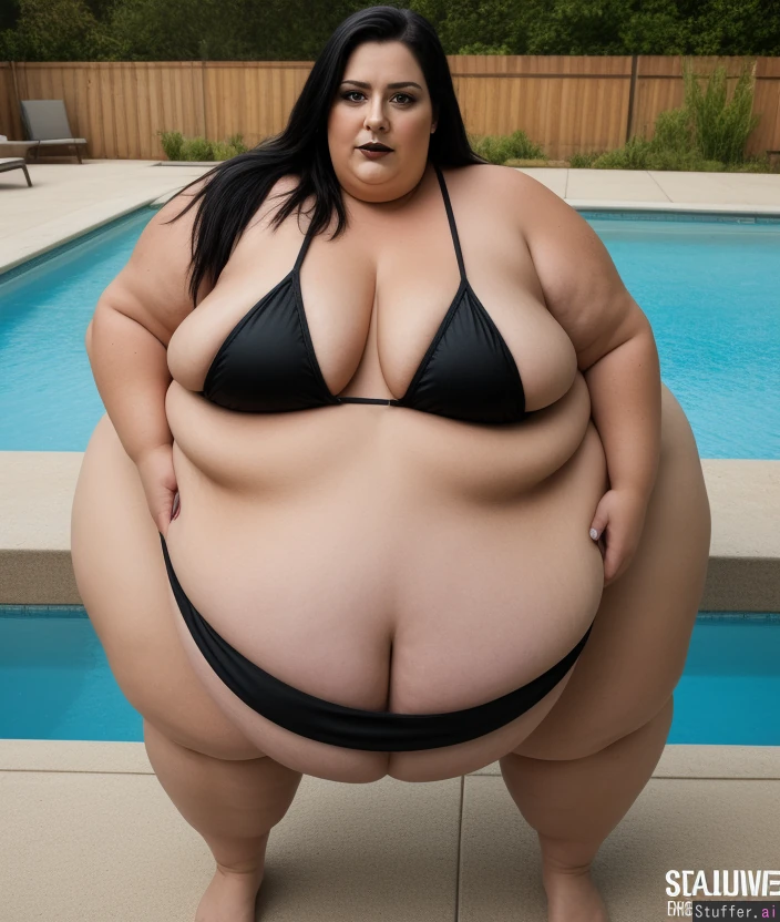 Photo realistic, realistic lighting, highly detailed, USSBBW, big tits, cleavage, under boob, chubby belly, detailed face, fat face, (double chin), (jet black hair, black lips), (massive tits:1.1), (massive belly:1.5), (massive arms:1.1), (massive legs:1.1), Beautiful woman, blonde, bikini, pool