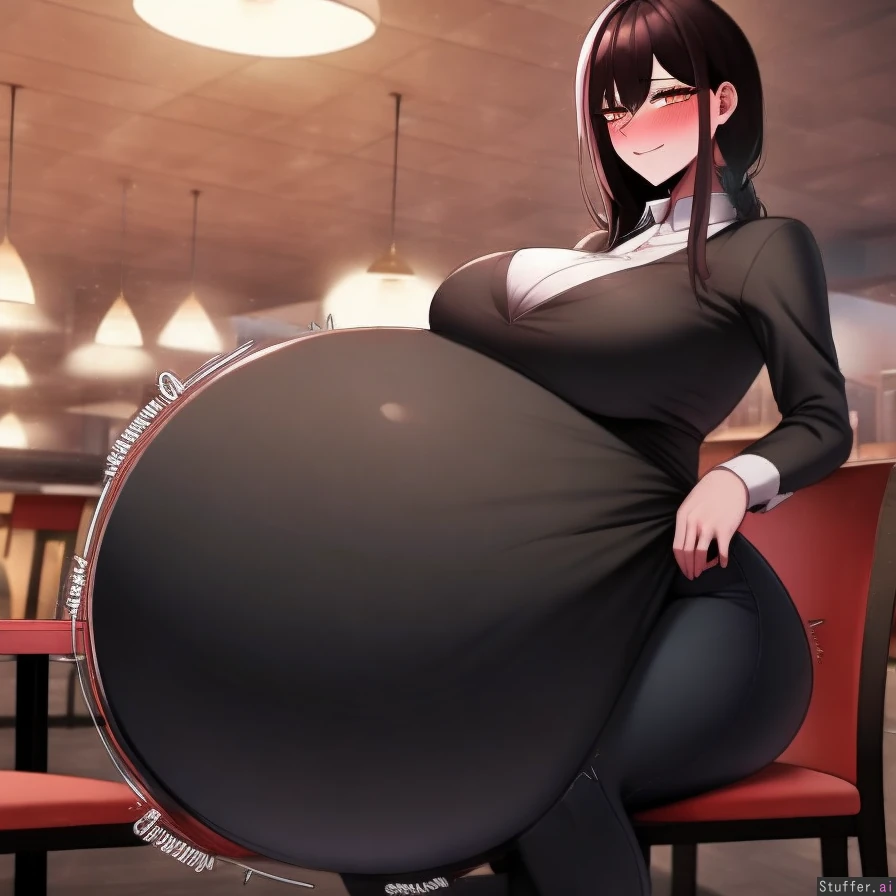 best quality, high rating, inflated, 1girl, massive_belly, huge_belly, tight_belly, creaking, huge_inflated_belly, noisy_stomach, tight_clothing, about_to_burst, going_to_pop, large_breasts, large_ass, inflated_belly, round_belly, makima_(chainsaw_man), restaurant, sitting, blushing, table