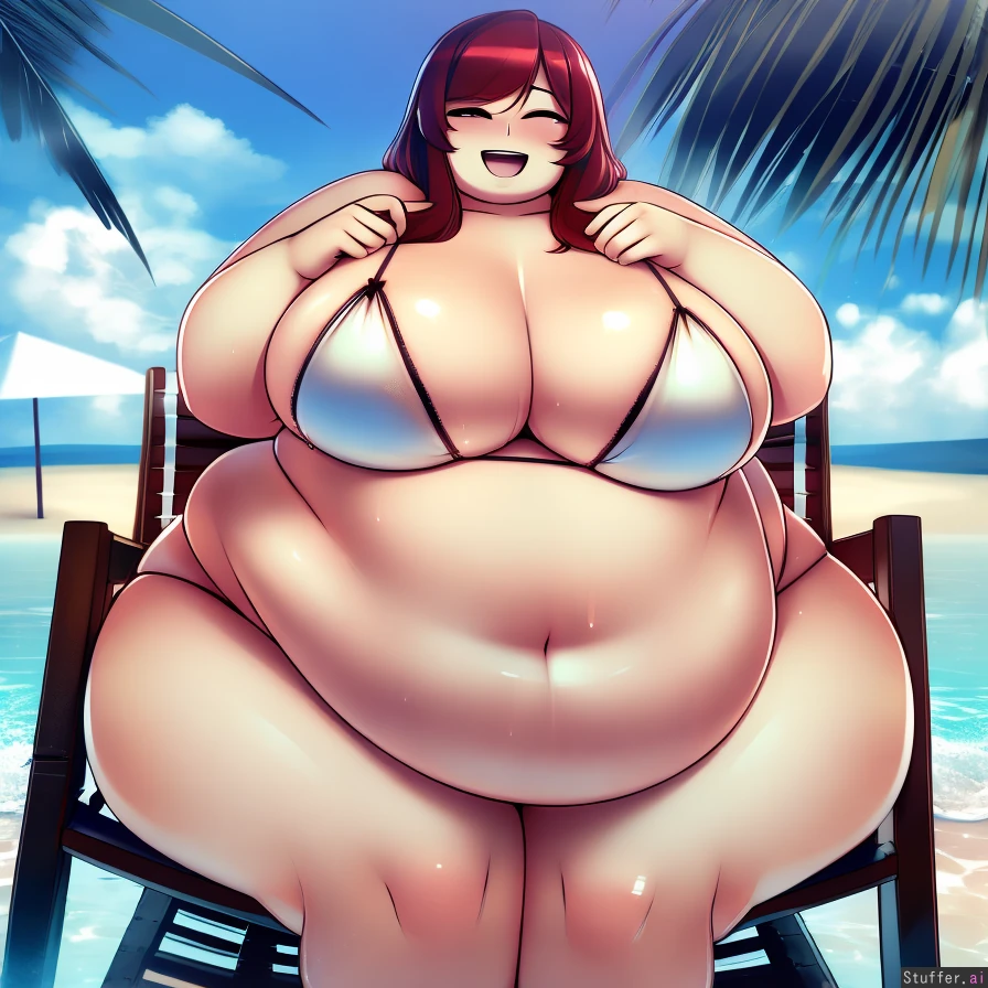 best quality, high rating, masterpiece, betterwithsalt (artist), sweetdreamcoffee (artist), ussbbw, rose hair, happy face, white bikini, sitting on lounge chair, on beach, big belly, doubled belly, big boobs, wide ass, huge ass, front view