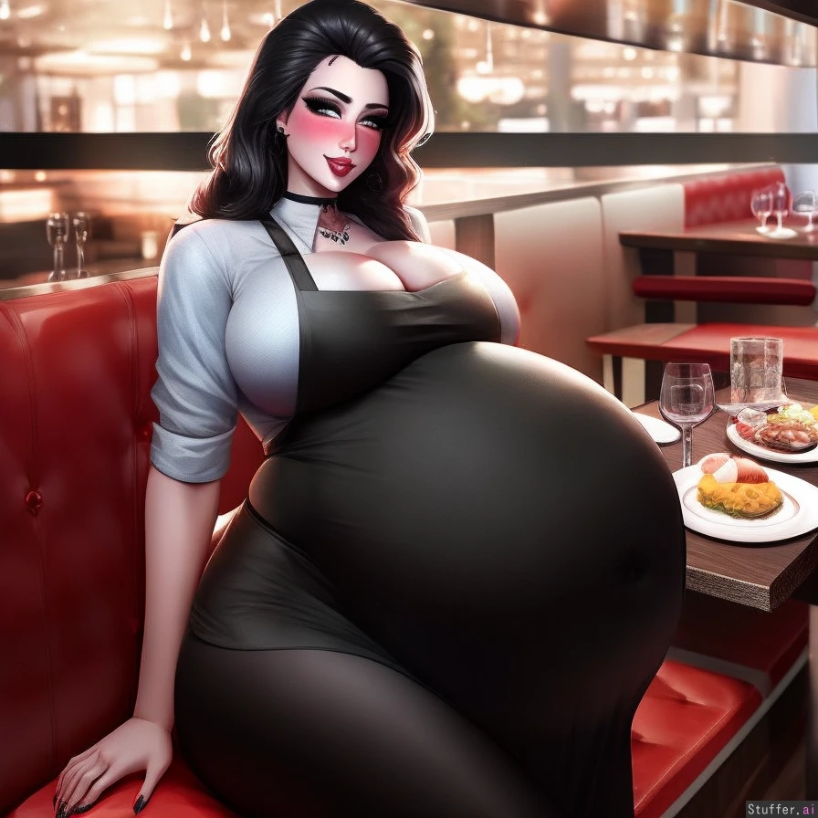 1girl, belly_inflation, huge_belly, massive_belly_inflation, round_belly, deep_navel, tight_clothing, blushing, horny, looking_at_viewer, cleavage, milf, black_hair, high_rating, high_quality, realistic, shaded, detailed, goth_girl, tightly_covered_belly, apron, restaurant, uniform