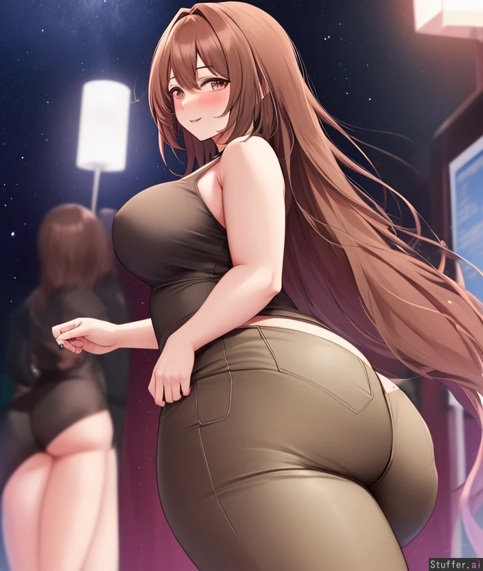 A pear-shaped girl dressed with a dark green suit and long shorts on a night party, huge hips, huge ass, small breasts, short hair, glasses, chubby belly, fat thighs