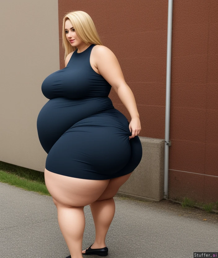 Blonde, hot, detailed face ((bottom heavy)) (wide hips) (thick thighs) sundress, chubby belly (pear shaped) bottom heavy (huge thighs) driveway ((huge thighs)) ((huge belly))