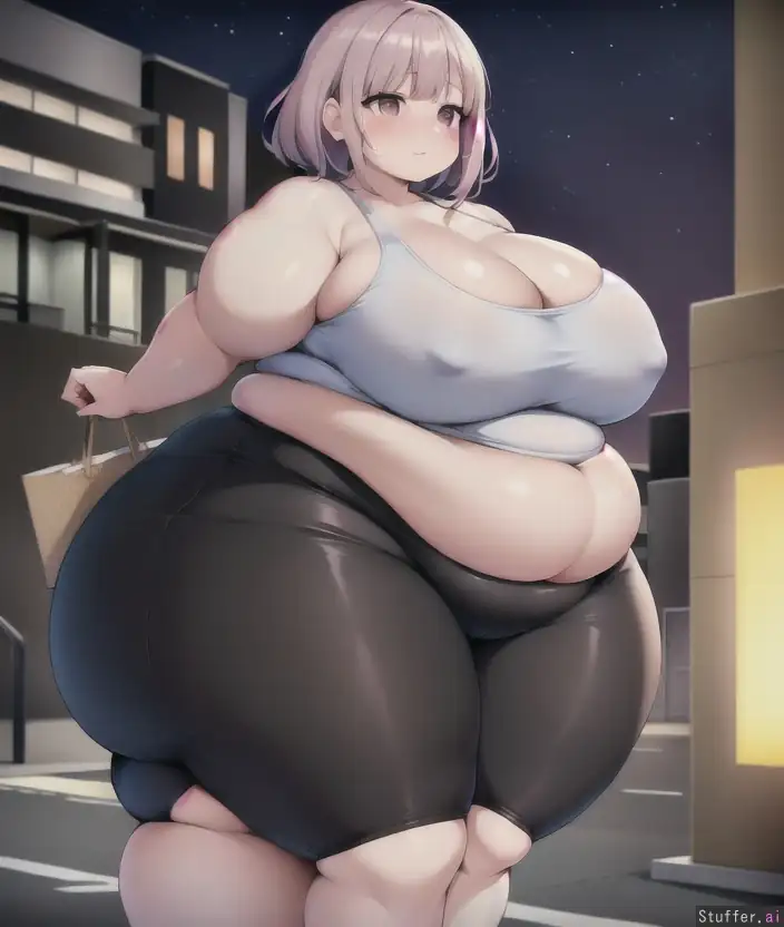 1girl, chiaki nanami, pale mauve hair, city at night, ssbbw, thick thighs, fat belly, wide hips, struggling to walk, huge ass, (((fat arms))), embarrassed, undersized clothes, fat ass, morbidly obese, tight gym shorts, love_handles, huge fat arms, hyper thighs, hyper hips, very tight sports bra, cleavage, immobile to move cause plump belly roll, large plump belly that immobile to move, short hair, (((blob))),