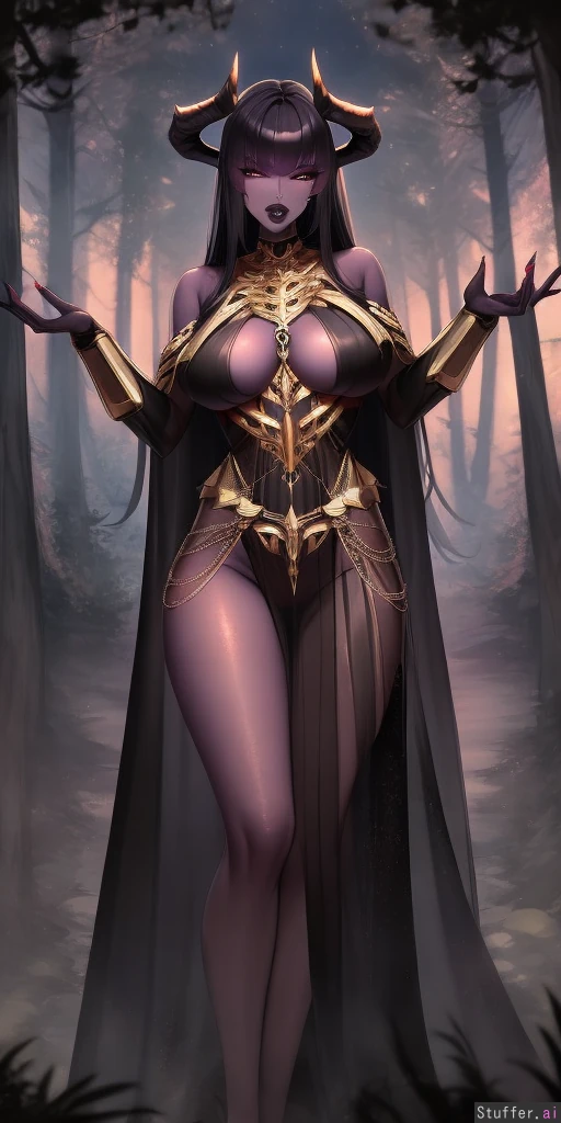 best quality, high rating,thick black outline, perfect anatomy,anime style, a demon_girl, black hair reaching her shoulders with a bangs covering her eye, dark purple skin, two huge horns, wearing a black armored_dress with golden elements, thick black lips, in forest at night