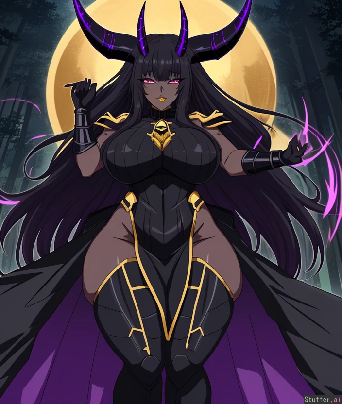 best quality, high rating,thick black outline, perfect anatomy,anime style, a demon_girl, black hair reaching her shoulders with a bangs covering her eye, dark purple skin, two huge horns, wearing a black armored_dress with golden elements, thick black lips, in forest at night , wide hips, hyper hips, thick thighs, anime girl