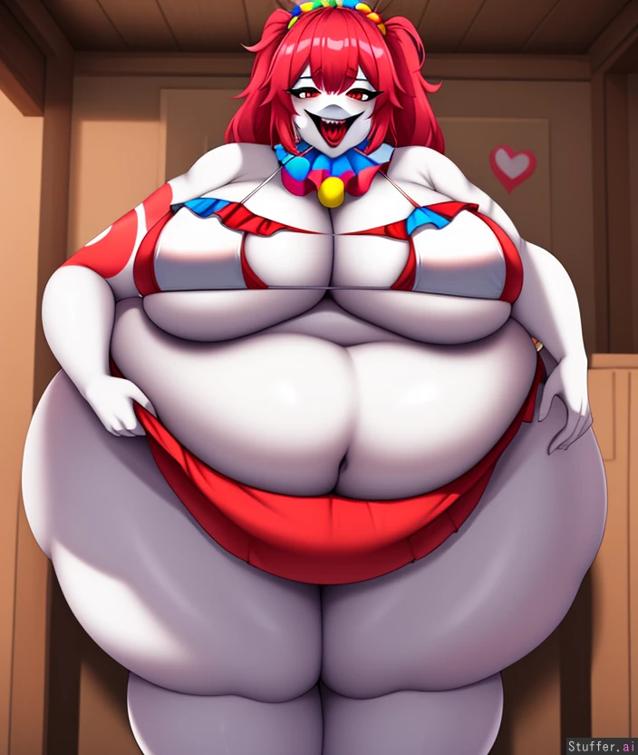Chalk white skin, bikini_top, bikini_skirt, morbidly_obese_female, clown, red fuzzy hair, vore_belly