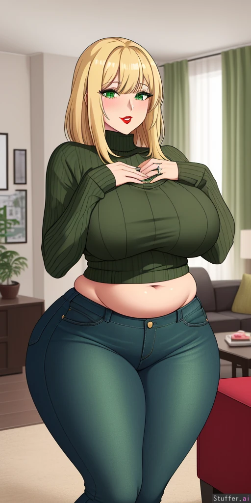 best quality, high rating,thick black outline, perfect anatomy,anime style, (A blonde woman, medium blonde hair reaching her shoulders, bangs covering her green eyes, thick red lips) (in living room) (saductive eyes, flirty, horny, hand over chest and her belly) (Wearing a dark green sweater and tight jeans) (Wide hips, huge hips, thick thighs, big boobs, pudgy_belly, big belly, round belly) (huge ass)