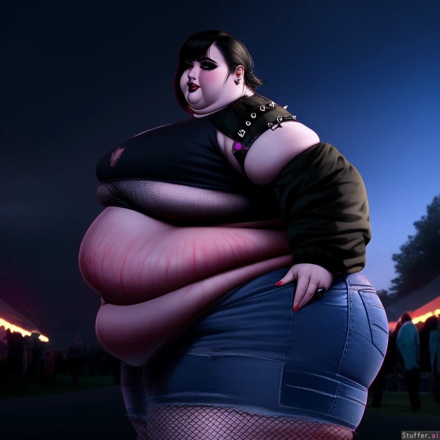 best quality, high rating, (masterpiece), (HD 4k resolution), (highly detailed), perfect anatomy, stylized realism, (side angle), realistic proportions, dynamic, (Obese), obese genz goth girl, big fat round unflattering belly, uncomfortably stuffed, about to pop, bloated, sagging belly, big lovehandles, (detailed fat_face, double chin, detailed large eyes with pupils), flabby arms, narrow_hips, pretty, stretchmarks on her skin, black_hair, (messy pixiecut short hair with bangs), (wearing a tattered tshirt, punk bomber jacket, fishnet stockings, punk boots, unbuttoned punk jeans), (moobs), sagging bellybutton, big belly tattoo, fat thighs, holding a beer_bottle, heavy_eyeliner, ((Standing leaning_back at an outdoor music festival, nighttime, moody lighting)),