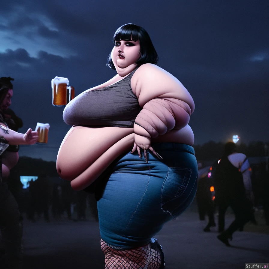 best quality, high rating, (masterpiece), (HD 4k resolution), (highly detailed), perfect anatomy, stylized realism, (side angle), realistic proportions, dynamic, (Obese), obese genz goth girl, big fat round unflattering belly, uncomfortably stuffed, about to pop, bloated, sagging belly, big lovehandles, (detailed fat_face, double chin, detailed large eyes with pupils), flabby arms, narrow_hips, pretty, stretchmarks on her skin, black_hair, (messy pixiecut short hair with bangs), (wearing a tattered tshirt, punk bomber jacket, fishnet stockings, punk boots, unbuttoned punk jeans), (moobs), sagging bellybutton, big belly tattoo, fat thighs, holding a beer_bottle, heavy_eyeliner, ((Standing leaning_back at an outdoor music festival, nighttime, moody lighting)),