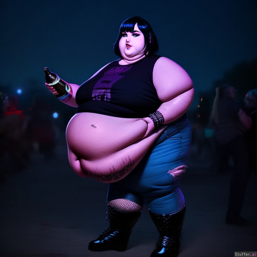 best quality, high rating, (masterpiece), (HD 4k resolution), (highly detailed), perfect anatomy, stylized realism, (side angle), realistic proportions, dynamic, (Obese), obese genz goth girl, big fat round unflattering belly, uncomfortably stuffed, about to pop, bloated, sagging belly, big lovehandles, (detailed fat_face, double chin, detailed large eyes with pupils), flabby arms, narrow_hips, pretty, stretchmarks on her skin, black_hair, (messy pixiecut short hair with bangs), (wearing a tattered tshirt, punk bomber jacket, fishnet stockings, punk boots, unbuttoned punk jeans), (moobs), sagging bellybutton, big belly tattoo, fat thighs, holding a beer_bottle, heavy_eyeliner, ((Standing leaning_back at an outdoor music festival, nighttime, moody lighting)),