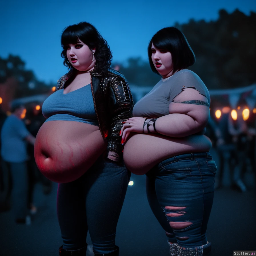 best quality, high rating, (masterpiece), (HD 4k resolution), (highly detailed), perfect anatomy, stylized realism, (side angle), realistic proportions, dynamic, chubby genz goth girl, fat round unflattering belly, uncomfortably stuffed, about to pop, bloated, sagging belly, big lovehandles, (detailed fat_face, double chin, detailed large eyes with pupils), flabby arms, narrow_hips, pretty, stretchmarks on her skin, black_hair, (wavy hair, pixiecut short hair with bangs), (wearing a tattered tshirt, punk bomber jacket, fishnet stockings, punk boots, unbuttoned punk jeans), (moobs), sagging bellybutton, big belly tattoo, fat thighs, holding a beer_bottle, heavy_eyeliner, ((Standing leaning_back at an outdoor music festival, nighttime, moody lighting)),