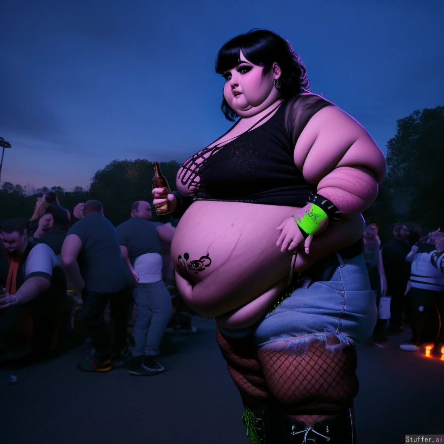 best quality, high rating, (masterpiece), (HD 4k resolution), (highly detailed), perfect anatomy, stylized realism, (side angle), realistic proportions, dynamic, chubby genz goth girl, fat round unflattering belly, uncomfortably stuffed, about to pop, bloated, sagging belly, big lovehandles, (detailed fat_face, double chin, detailed large eyes with pupils), flabby arms, narrow_hips, pretty, stretchmarks on her skin, black_hair, (wavy hair, pixiecut short hair with bangs), (wearing a tattered tshirt, punk bomber jacket, fishnet stockings, punk boots, unbuttoned punk jeans), (moobs), sagging bellybutton, big belly tattoo, fat thighs, holding a beer_bottle, heavy_eyeliner, ((Standing leaning_back at an outdoor music festival, nighttime, moody lighting)),