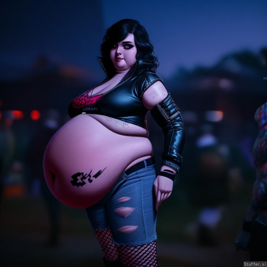 best quality, high rating, (masterpiece), (HD 4k resolution), (highly detailed), perfect anatomy, stylized realism, (side angle), realistic proportions, dynamic, chubby genz goth girl, fat round unflattering belly, uncomfortably stuffed, about to pop, bloated, big lovehandles, (detailed chubby_face, double chin, detailed large eyes with pupils), flabby arms, narrow_hips, pretty, stretchmarks on her skin, black_hair, (wavy hair, pixiecut short hair with wavy bangs), (wearing punk clothes, tattered tshirt, punk bomber jacket, fishnet stockings, punk boots, unbuttoned punk jeans), (moobs), sagging bellybutton, big belly tattoo, fat thighs, holding a beer_bottle, heavy_eyeliner, ((Standing leaning_back at an outdoor music festival, nighttime, moody lighting)),