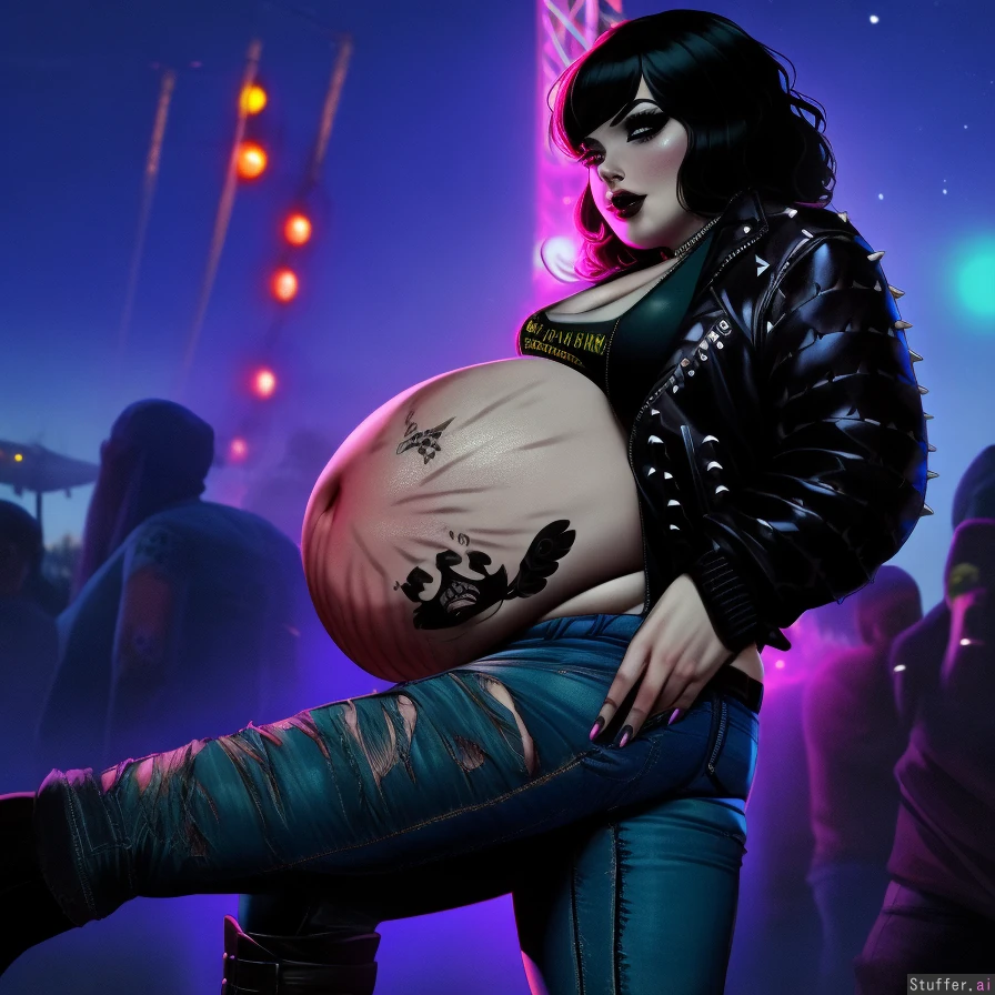 best quality, high rating, (masterpiece), (HD 4k resolution), (highly detailed), perfect anatomy, stylized realism, (side angle), realistic proportions, dynamic, chubby genz goth girl, fat round unflattering belly, uncomfortably stuffed, about to pop, bloated, big lovehandles, (detailed chubby_face, detailed large eyes with pupils), flabby arms, narrow_hips, pretty, stretchmarks on her skin, black_hair, (wavy hair, pixiecut short hair with wavy bangs), (wearing punk clothes, tattered tshirt, punk bomber jacket, fishnet stockings, punk boots, unbuttoned punk jeans), (moobs), sagging bellybutton, big belly tattoo, fat thighs, holding a beer_bottle, heavy_eyeliner, ((Standing leaning_back at an outdoor music festival, nighttime, moody lighting)),