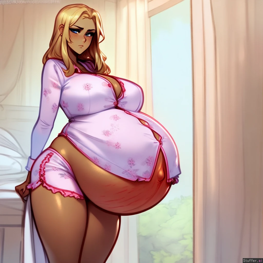 best quality, high rating, (1 girl), blushyspicy(artist), spellsX(artist), cutesexyrobutts(artist), namiorii(artist), masterpiece, high quality, 8k, high resolution best quality, high rating, tanned blonde, soft loving maternal pretty youthful hyper Pregnant doting housewife standing in bedroom, long widening bulbous shape hyper belly having trouble moving, still getting used to being permanently pregnant-looking, used to be slim, snug pink satin pajama small button pajama blouse with bottom buttons pinged off only fits half of belly and mini pajama shorts digging into soft hips, ((midriff exposed)), belly showing through bottom of shirt, pushing belly out in front of her, solo, trying to support belly with one hand, barefoot, red painted toenails, thick thighs, plates from previous meals left on surfaces in room, her enlarged sweet tooth has changed her made her gluttonous, thigh dimples, aloof but also purposefully trying to get bigger, heavy breasts folded over shirt resting on top of belly, curvy pear figure,, anime, barely recognizes self from what she used to be like, ((massive prominent outie navel with prominent linea nigra)), underbelly no stretchmarks', little queasy, narrow waist, flirtatiously begging you to rub her belly, 260lbs, big lower legs thick thighs