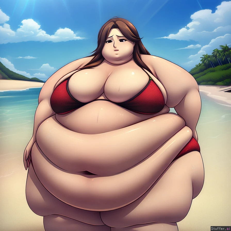 best quality, high rating, better-with-salt (artist), miramiraclerun (artist), 1 girl, ssbbw, morbidly obese, deep navel, long brown hair, black eyes, red bikini, beach, standing, not ashamed,