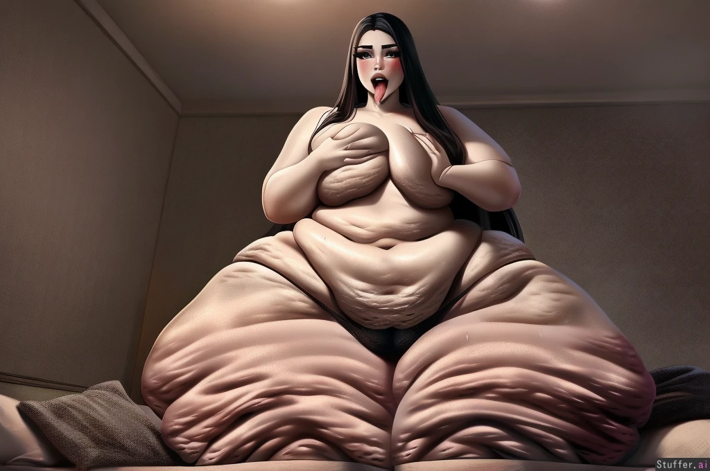 best quality, high rating, insanely detailed, (((hyper realistic))), UHD, HDR, smooth texture, beautiful face, beautiful eyes, (((big_ass:1.5))), (((big_thighs:1.5))), (cellulite:2.0), (((pear-shaped_body:2.0))), (((huge wide hips:1.5))), fat, fat_ass, fat_belly, sweaty, sweaty_butt, sweaty_breasts, sweaty_body, ssbbw, bbw, (((long_hair:2.0))), heavy_breathing, sexy, sexy_pose, laying_down, ass_visible_from_front, ass_bigger_than_body ass_visible_through_thighs, thick_thighs, thicc, tongue_out, touching, self_breast_sucking, self_lick, self_touching, open mouth light_skin, bedroom, fat arms, (looking at viewer, facing viewer:1.4),