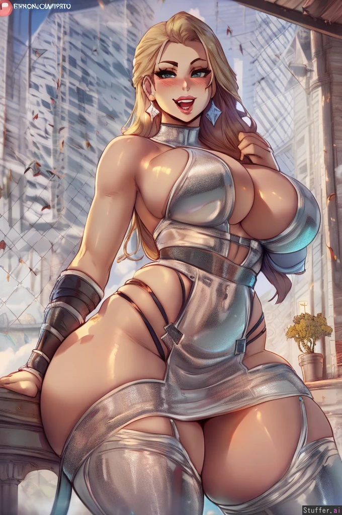best quality, high rating, (absurdres), (photorealistic:0.9, (realistic lighting, dynamic lighting), (highest detail, extremely detailed), (highest quality), (clear colours, strong colours), Carmessi(artist), tashoelle(artist), bambooale(artist), blushyspicy(artist), spellsx(artist), shexyo(artist), kipteitei(artist), cutesexyrobutts(artist), icecake(artist), (seductive pose), (photorealistic face:2.1, detailed beautiful face high quality face), stunning beauty, detailed features, perfect smooth skin, detailed skin texture, soft skin, (extremely tall, tall height and proportions, as tall as the room), (seductive expression, flirty expression, very horny expression, mischievous, big happy smile, blush, open mouth, hot and bothered), (beautiful eyes, seductive eyes), beautiful body, (plump heavy boobs), (plump massive wide heavy fat ass), (gigantic wide thick hips, big high hips, massive hip dips, diagonal hip lines) (sbbw body, voluptuous body), (long torso), (soft slightly chubby belly), (love handles), (extremely chubby), (thick thighs), (bottom heavy body shape), earrings, glossy bright lipstick, ((emma frost from marvel rivals)), ((emma frost from marvel rivals hair style and hair colour)), ((emma frost from marvel rivals outfit)), (natural skin tone), 3/4 view from front, (appropriate background),