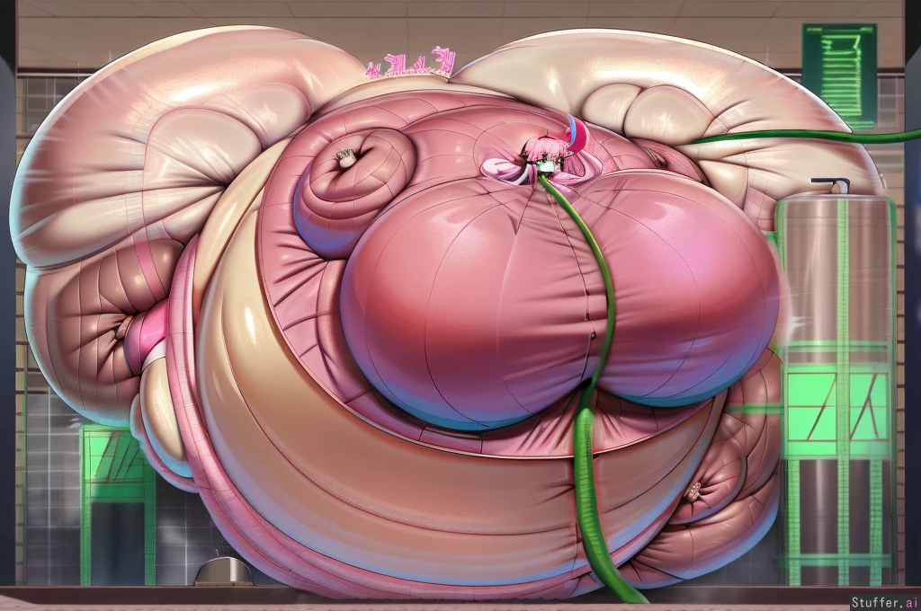 best quality, high rating, anime_woman, bocchi, colossal_breasts, colossal_belly, colossal_ass, pink_hair, long_hair, green_eyes, fat_female, anime_highlights, anime_style, swelling, inflating, inflated, pink_shirt, pink_shorts, hose_in_ass, hose_inflation,