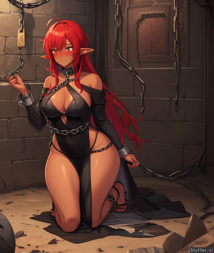 elf_girl, dark_skin, red_hair, messy_hair, long_hair, shy_face, hungry_face, skinny, curvy_body, handcuffs, black_dress, kneeling, medieval_room, prison, chains