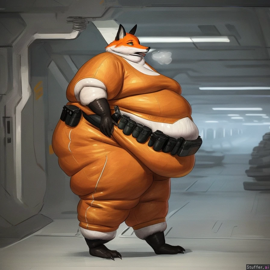 best quality, high rating, (masterpiece), (HD 4k resolution), (highly detailed), Cettus(artist), (3D render), perfect anatomy, (side angle), realistic proportions, solo, full body, ((Obese anthro fox female)), huge round unflattering belly, about to pop, bloated, sagging belly, big lovehandles, (detailed fat face, double chin squished against her chest, detailed large eyes with pupils), flabby arms, narrow_hips, stretchmarks on her skin, (fully clothed wearing an orange jumpsuit with a utility belt), (moobs), obese_thighs, (walking down a futuristic space station service hallway, out of breath),