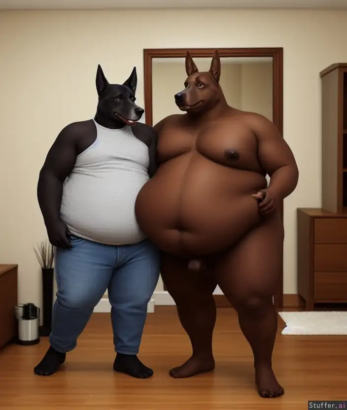 Male, morbidly obese, furry art, anthropomorphic black and brown doberman, standing in front of a mirror in the living room, big belly, big moobs, belly grab.