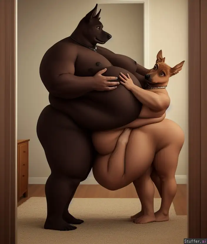 Male, morbidly obese, furry art, anthropomorphic black and brown doberman, standing in front of a mirror in the living room, big belly, big moobs, belly grab.