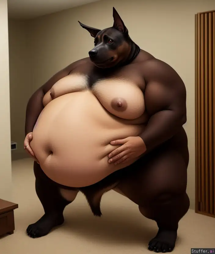 Male, morbidly obese, furry art, anthropomorphic black and brown doberman, standing in front of a mirror in the living room, big belly, big moobs, belly grab.