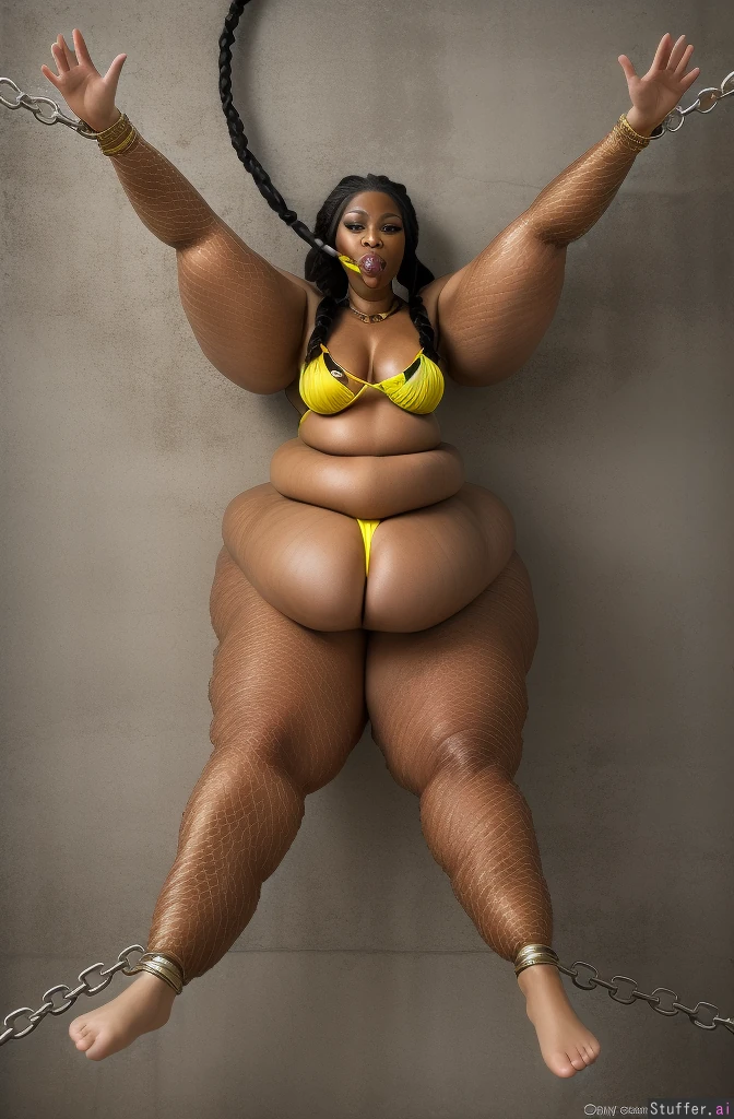 Photo realistic, highly detailed, realistic lighting, bright lighting, african bbw, wearing a yellow bikini:1.4, beautiful face, perfect face, detailed face, black hair, (braided har:1.4), (ultra huge legs:1.6), ultra huge arms:1.6), chained limbs, perfect feet, bare feet, (((concrete wall background))), force fed, ((feeding tube)), mouth sucking on feeding tube, (ultra detailed feet:1.4), (ultra quality feet:1.8)