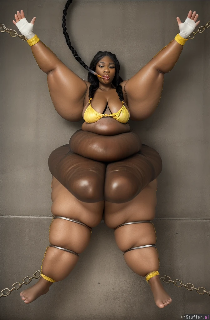 Photo realistic, highly detailed, realistic lighting, bright lighting, african bbw, wearing a yellow bikini:1.4, beautiful face, perfect face, detailed face, black hair, (braided har:1.4), (ultra huge legs:1.8), ultra huge arms:1.8), (ultra leg rolls:1.7), chained limbs, perfect feet, bare feet, (((concrete wall background))), force fed, ((feeding tube)), mouth sucking on feeding tube, (ultra detailed feet:1.4), (ultra quality feet:1.8)
