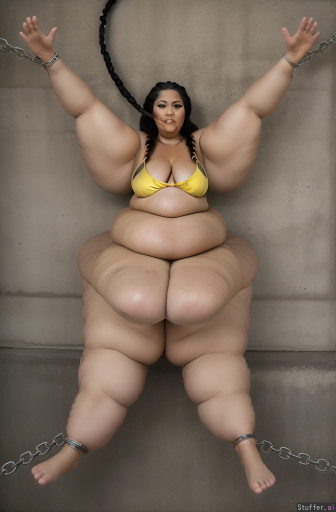 Photo realistic, highly detailed, realistic lighting, bright lighting, african ssbbw, wearing a yellow bikini:1.4, beautiful face, perfect face, detailed face, (ultra double chin:1.5), black hair, (braided har:1.4), (ultra huge legs:1.8), ultra huge arms:1.8), chained limbs, perfect feet, bare feet, (((concrete wall background))), force fed, ((feeding tube)), mouth sucking on feeding tube, (ultra detailed feet:1.4), (ultra quality feet:1.8)