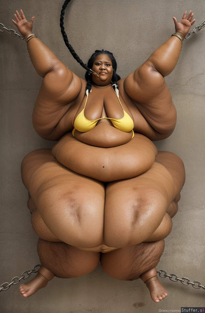 Photo realistic, highly detailed, realistic lighting, bright lighting, african ssbbw, dark skin, wearing a yellow bikini:1.4, beautiful face, perfect face, detailed face, (ultra double chin:1.8), black hair, (braided har:1.4), (ultra huge legs:1.8), ultra huge arms:1.8), chained limbs, perfect feet, bare feet, (((concrete wall background))), force fed, ((feeding tube)), mouth sucking on feeding tube, (ultra detailed feet:1.4), (ultra quality feet:1.8)
