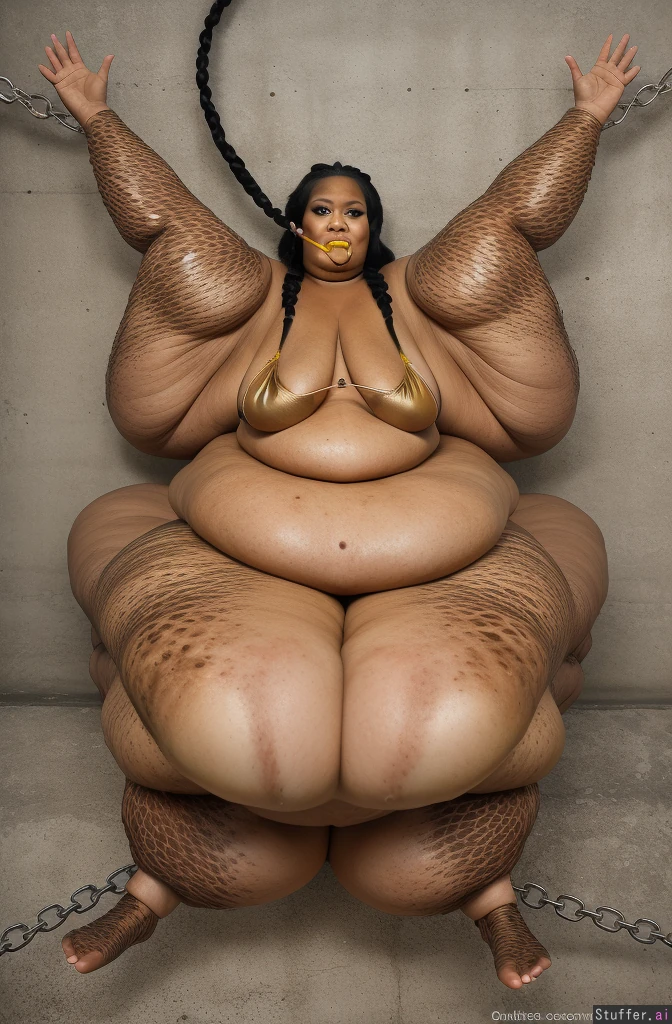 Photo realistic, highly detailed, realistic lighting, bright lighting, african ssbbw, dark skin, wearing a yellow bikini:1.4, beautiful face, perfect face, detailed face, (ultra double chin:1.8), black hair, (braided har:1.4), (ultra huge legs:1.8), ultra huge arms:1.8), chained limbs, perfect feet, bare feet, (((concrete wall background))), force fed, ((feeding tube)), mouth sucking on feeding tube, (ultra detailed feet:1.4), (ultra quality feet:1.8)