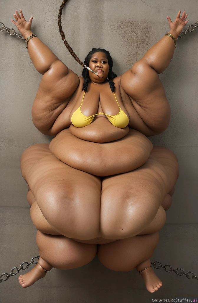Photo realistic, highly detailed, realistic lighting, bright lighting, african ssbbw, dark skin, wearing a yellow bikini:1.4, beautiful face, perfect face, detailed face, (ultra double chin:1.8), black hair, (braided har:1.4), (ultra huge legs:1.8), ultra huge arms:1.8), chained limbs, perfect feet, bare feet, (((concrete wall background))), force fed, ((feeding tube)), mouth sucking on feeding tube, (ultra detailed feet:1.4), (ultra quality feet:1.8)