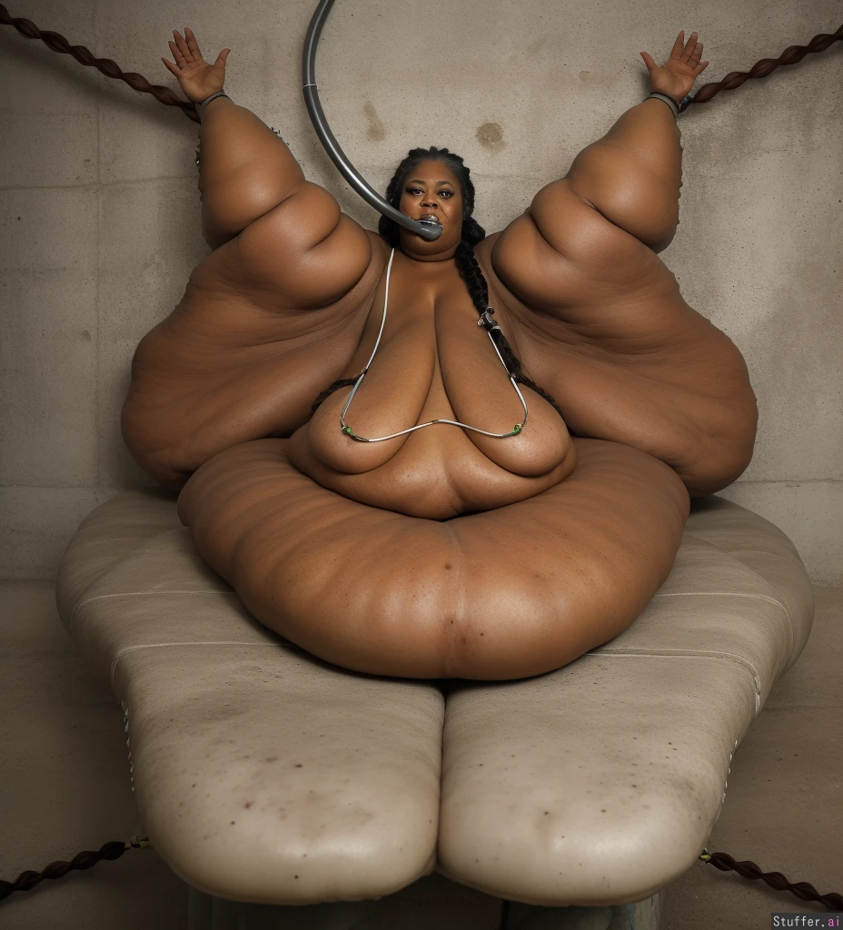 Photo realistic, highly detailed, realistic lighting, bright lighting, african ssbbw, dark skin, wearing a yellow bikini:1.4, beautiful face, perfect face, detailed face, (ultra double chin:1.8), black hair, (braided har:1.4), (ultra huge legs:1.8), ultra huge arms:1.8), chained limbs, perfect feet, bare feet, (((concrete wall background))), force fed, ((feeding tube)), mouth sucking on feeding tube, (ultra detailed feet:1.4), (ultra quality feet:1.8)