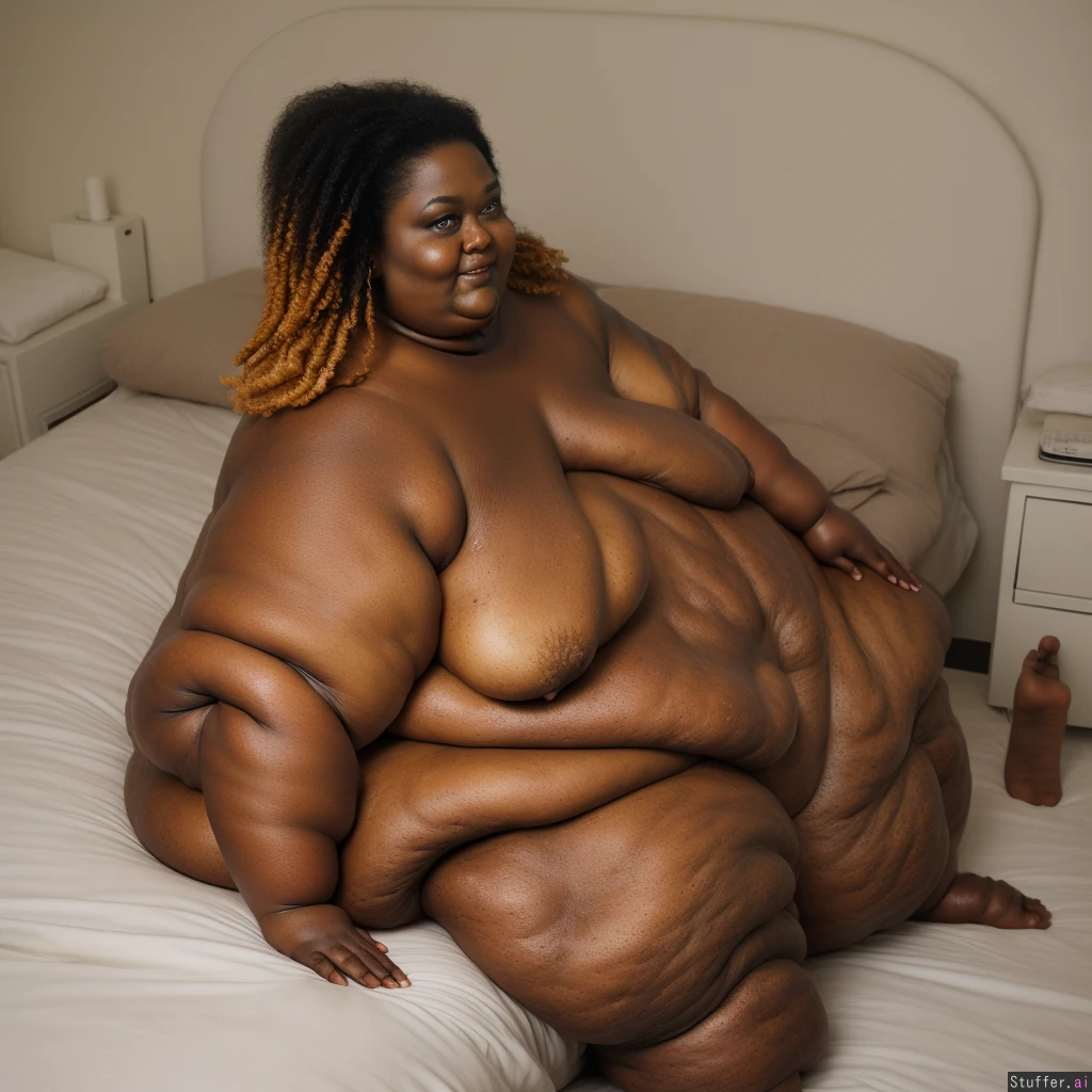 Photo realistic, highly detailed, realistic lighting, bright lighting, african bbw, black hair:1.4, dark skin:1.4, beautiful face, (ultra double chin:1.8), (ultra fat face:1.4), (naked:1.4), (small breasts:1.4), (((ultra huge arms:1.8))), (ultra huge legs:1.9), (ultra leg rolls:1.7), (ultra cellulite:1.6), bare feet:1.4, sitting on a bed:1.4,