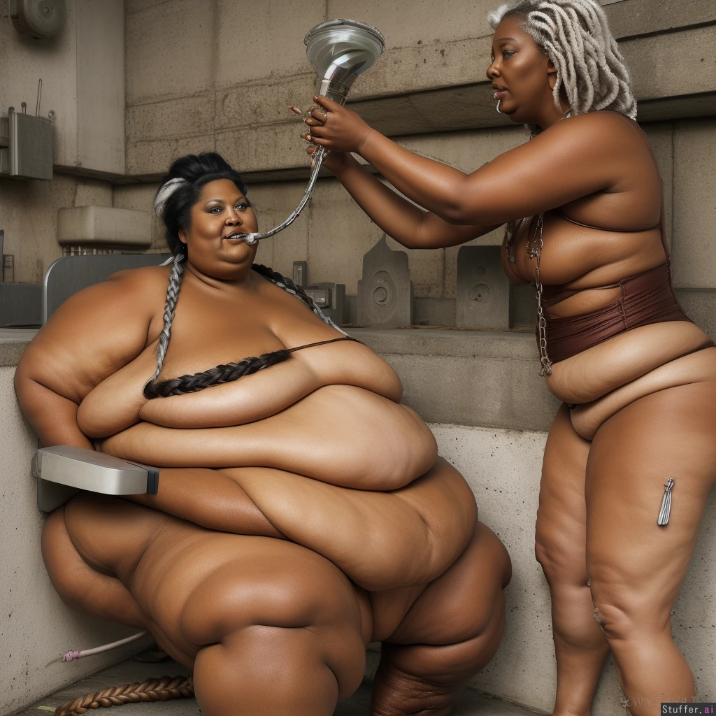 Photo realistic, highly detailed, realistic lighting, bright lighting, african ssbbw and german woman, (ultra double chin:1.8), black hair, (braided har:1.4), (ultra huge legs:1.8), ultra huge arms:1.8), chained limbs, perfect feet, bare feet, (((concrete wall background))), force fed, ((feeding tube)), mouth sucking on feeding tube,