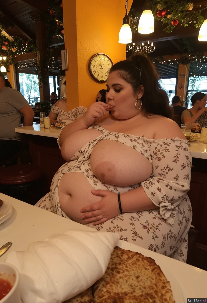 24K RAW DSLR ultra detail photograph, 23-year-old morbidly obese young Persian ssbbw girl with the largest adipose gut ever seen pushing Against her dress and a beautiful youthful face resembling a gorgeous young celebrity, sitting in profile at a festive Italian buffet table in a romantic trattoria. (Fully clothed in a covering fat adipose floral oversized off-shoulder bloated summer dress and black leggings:1.4), her massive round gut piles forward in two enormous hanging folds that slump across her thick thighs and rest in her lap like a drooping globe, almost touching her knees. She's licking a giant ice cream cone. Glossy pink lips, eyeliner still perfect despite smears, youthful glow, smokey eyes, big hoop earrings, bracelet, beautiful long hair. Buffet overflowing with lasagne, spaghetti, garlic bread, tiramisu. Natural overcast daylight, side view, 35mm f/2.0, ultra detailed face and body silhouette. Small Bust, (cartoonishly exaggerated fat hanging belly under apparel:1.4), warm candlelight and food in background, razor-sharp. (No nudity:1.4), (completely clothed:1.4), (no belly exposed:1.4), safe for work,
